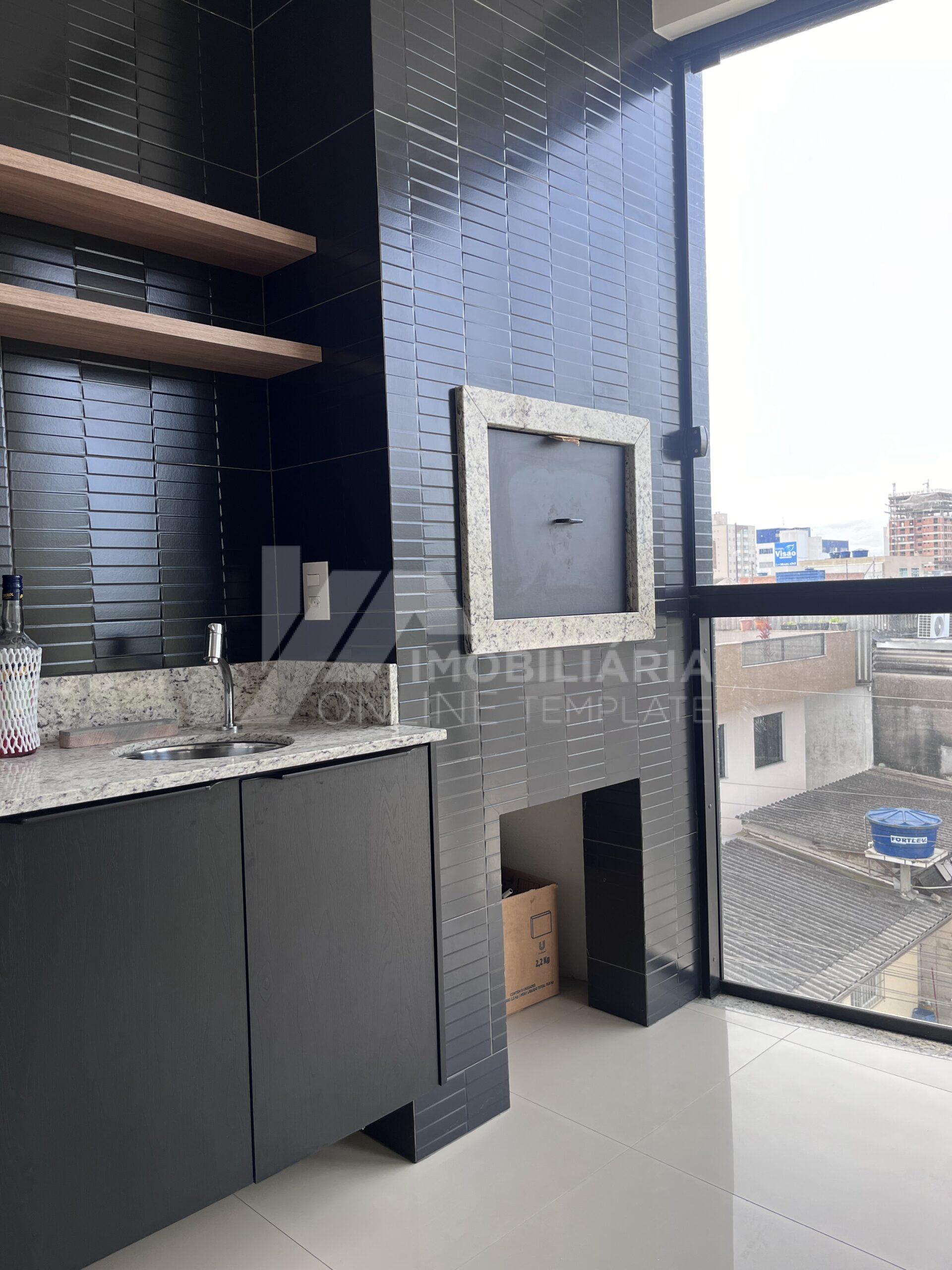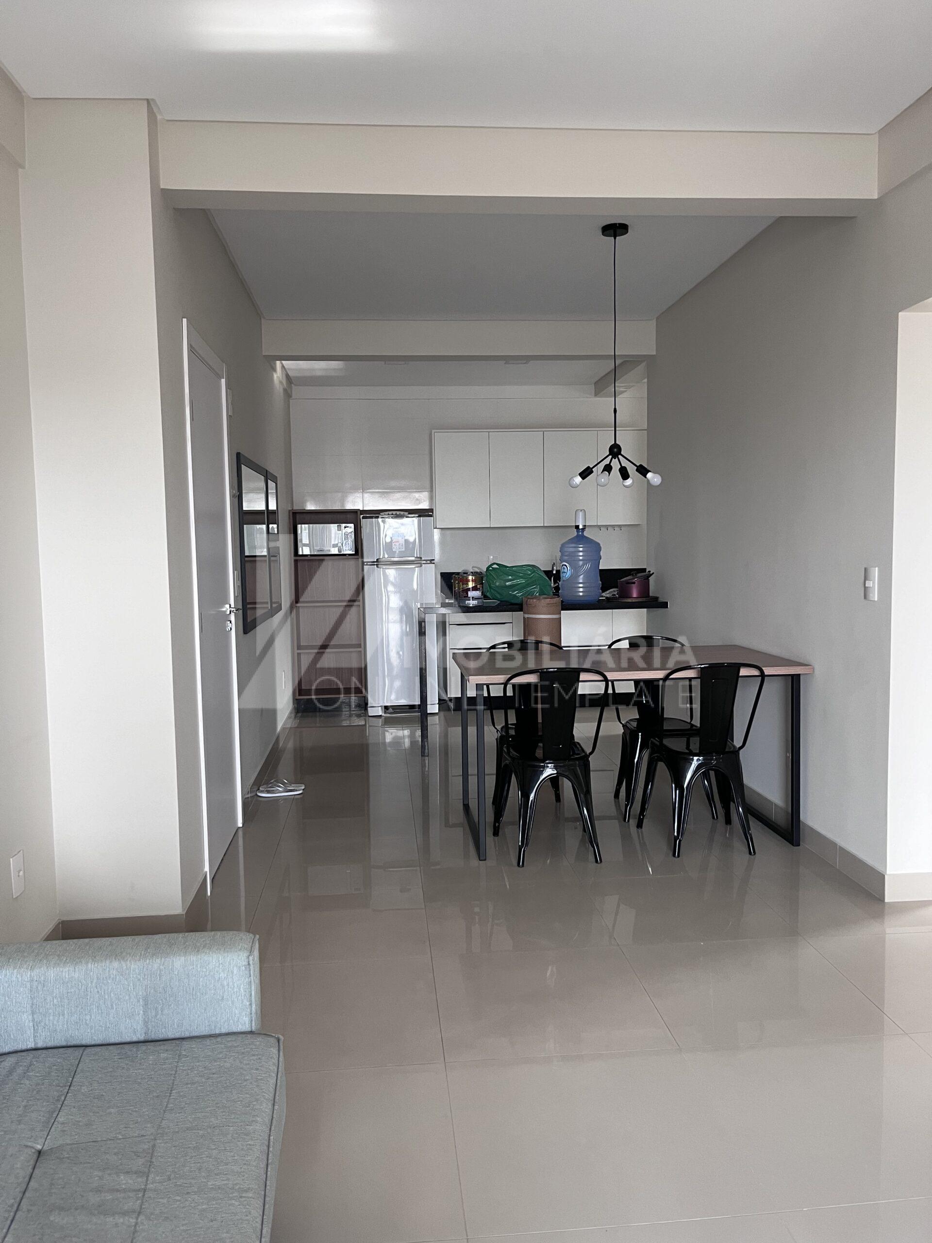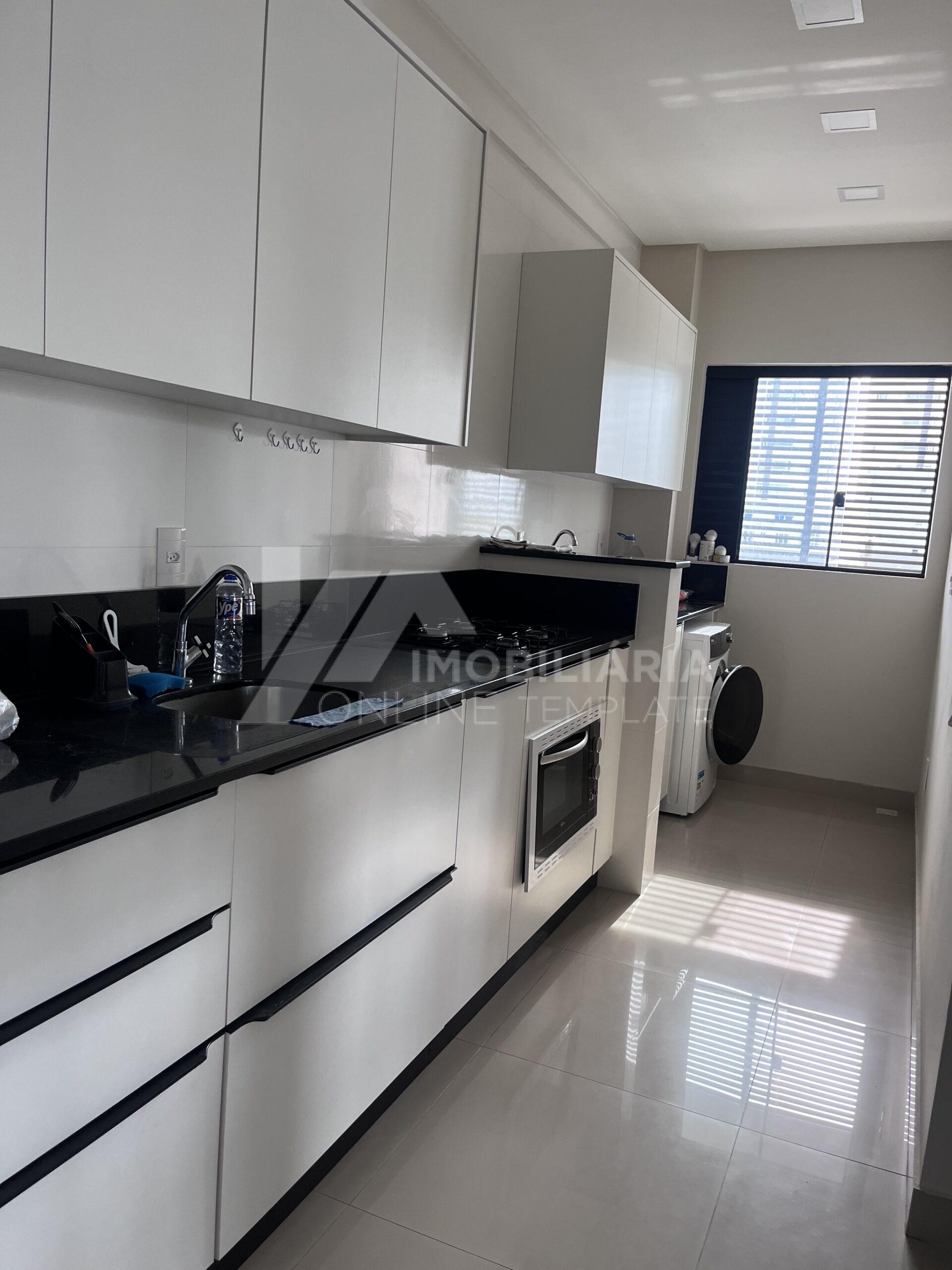 A sala de estar integrada à cozinha proporciona um ambiente moderno e aconchegante. A cozinha conta com móveis sob medida e espelhos, agregando sofisticação ao espaço. O imóvel também possui área de serviço independente.